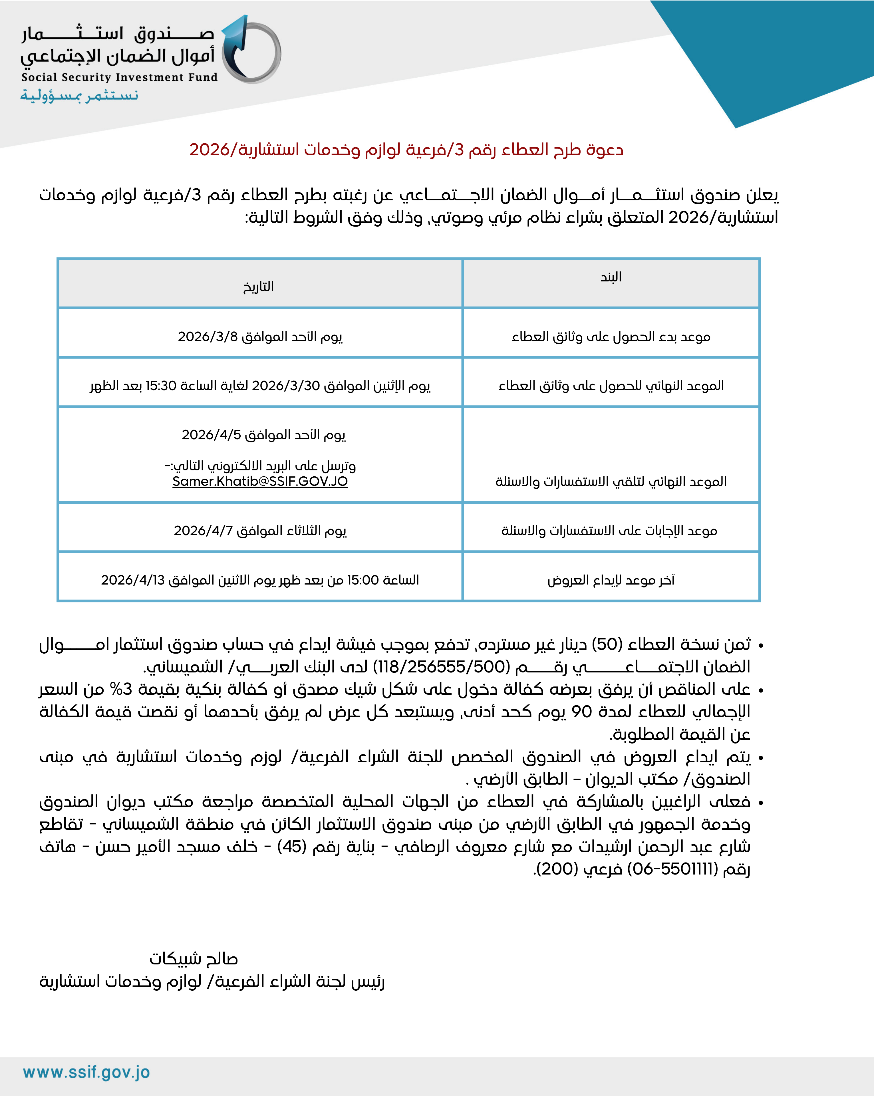 دعوة طرح العطاء رقم 3/ فرعية لوازم وخدمات استشارية/2026 المتعلق بشراء نظام مرئي وصوتي