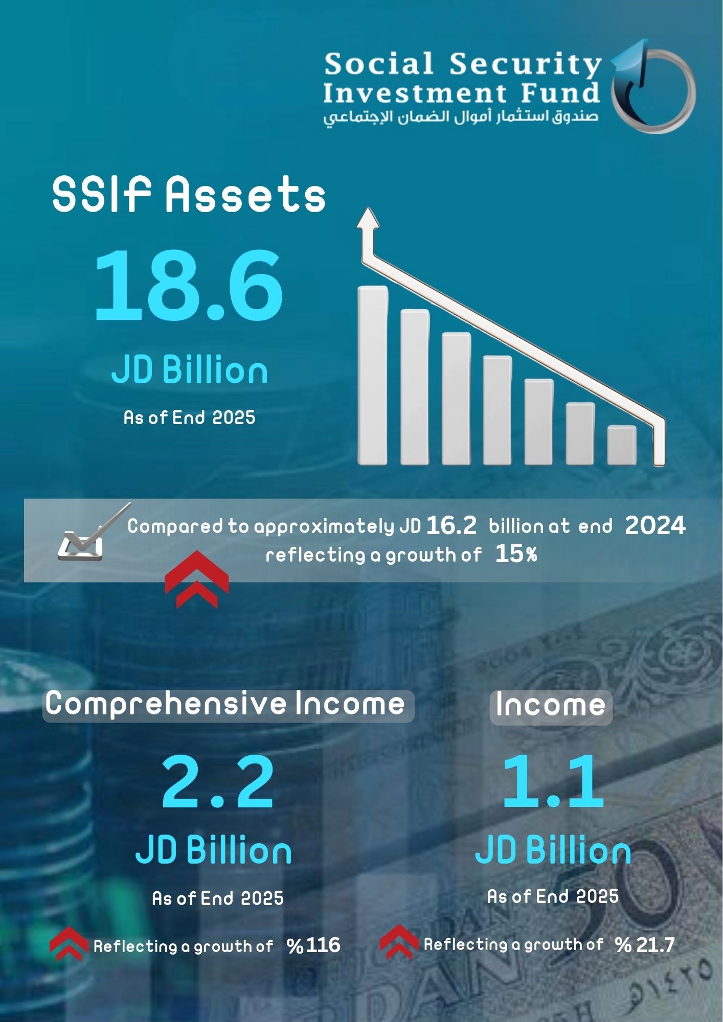 The assets of the Social Security Investment Fund (SSIF) recorded growth of JOD 2.4 billion, reaching JOD 18.6 billion by the end of 2025, compared to JOD 16.2 billion at the end of 2024, representing a growth rate of 15%.